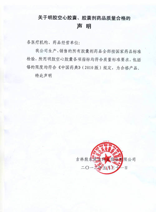 關(guān)于明膠空心膠囊、膠囊劑藥品質(zhì)量合格的聲明
