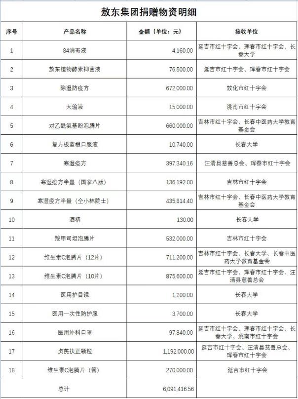 自今年3月初吉林省發(fā)生新冠肺炎疫情以來,面臨的防控疫情的形勢越來越嚴(yán)峻復(fù)雜,作為吉林省醫(yī)藥上市企業(yè),吉林敖東積極履行社會責(zé)任,踐行企業(yè)使命,發(fā)揮所長。本著實用性和必要性的原則開展捐贈活動,提供 “用得上、用得好”的抗疫藥品和抗疫物資,截止發(fā)稿日,吉林敖東藥業(yè)集團股份有限公司及所屬子公司累計捐贈藥品和防疫緊缺物資共計6,091,416.56元,助力打贏疫情阻擊戰(zhàn)。